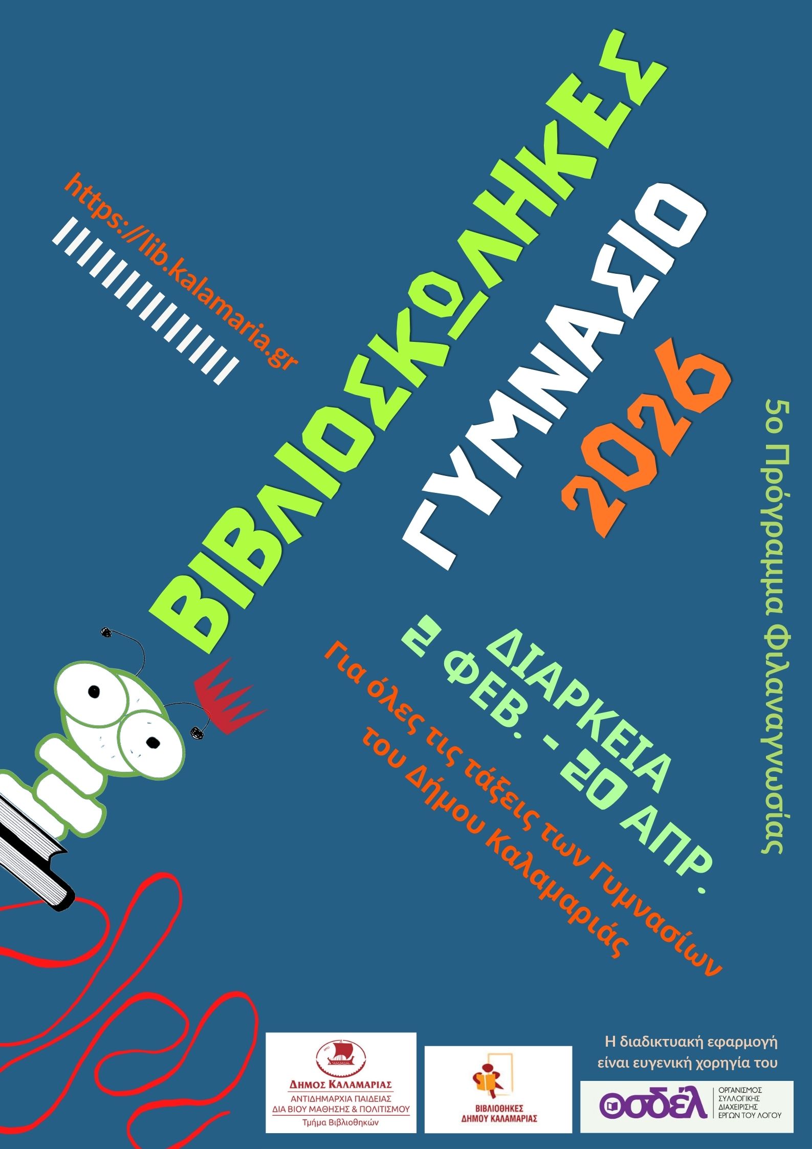 Οι Βιβλιοθήκες του Δήμου Καλαμαριάς προσκαλούν τα Γυμνάσια του Δήμου να συμμετέχουν σε μια τρίμηνη περίοδο εντατικής ανάγνωση(2 Φεβρουαρίου –  20 Απριλίου 2026) με το 5ο Πρόγραμμα Φιλαναγνωσίας Βιβλιοσκώληκες. Απώτερος σκοπός του προγράμματος  είναι η ίση πρόσβαση των μαθητών στην ανάγνωση αλλά και η προώθηση και η καλλιέργεια της αναγνωστικής τους σχέσης με τα βιβλία.