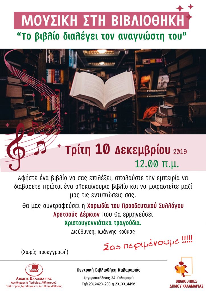 Αφήστε ένα βιβλίο να σας επιλέξει, την Τρίτη 10 Δεκεμβρίου 2019, στις 12 π.μ. στην Κεντρική Βιβλιοθήκη Καλαμαριάς και απολαύστε την εμπειρία να το διαβάσετε πρώτοι και να μοιραστείτε μαζί μας τις εντυπώσεις σας.